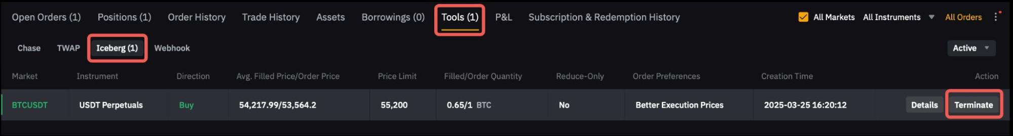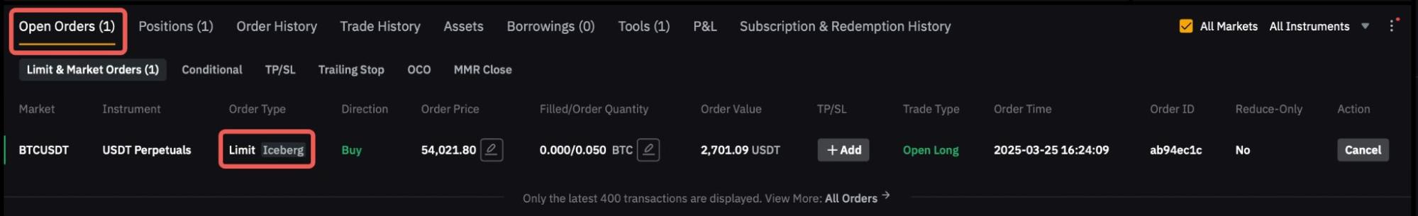 — Iceberg Orders are supported in both the Main Account and Subaccounts. Each account is limited to a maximum of 10 Iceberg Orders and each symbol can only open 1 Iceberg Order.