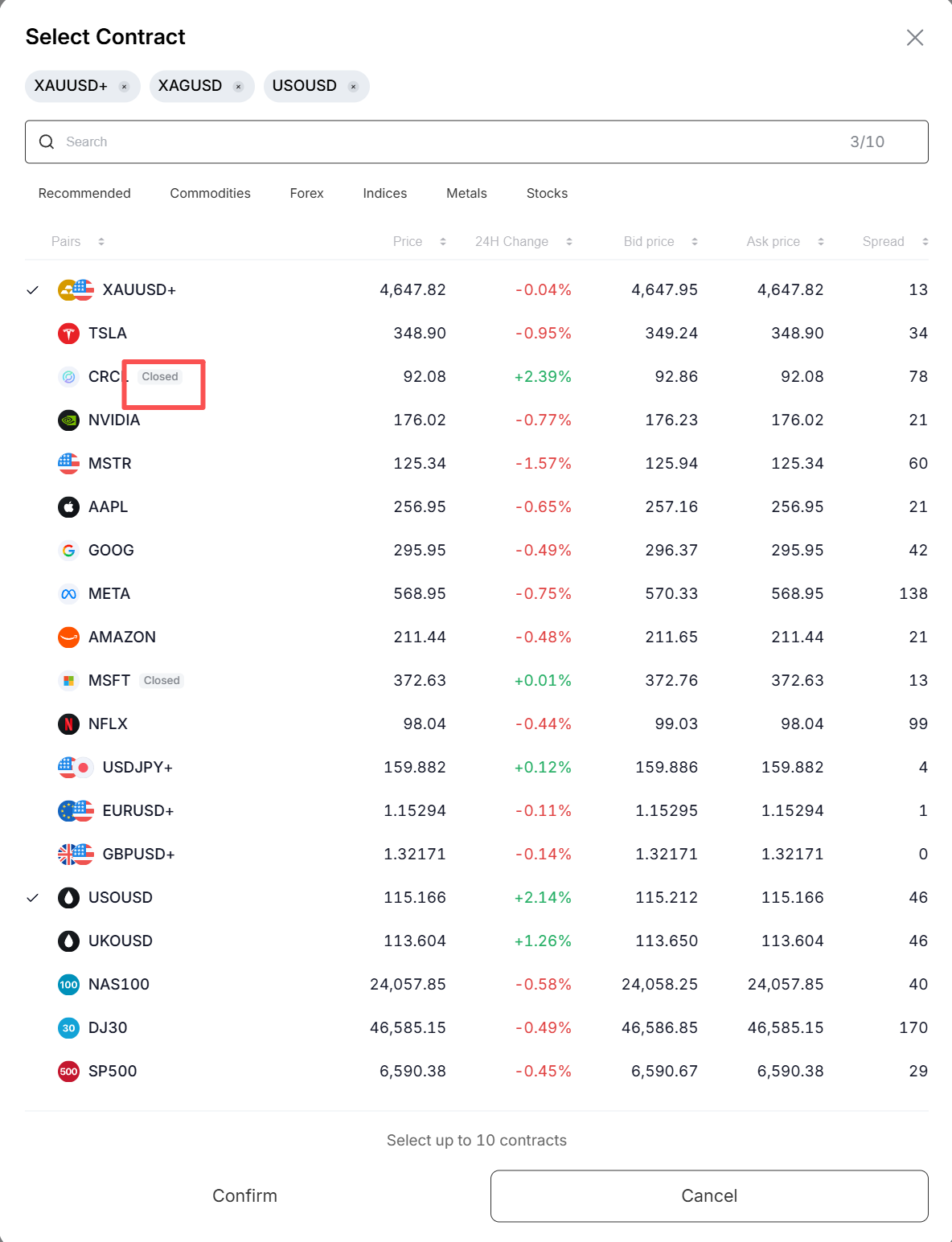 You can select between 2 and 10 contracts for each TradFi Combo Bot and customize their weights based on your preferences. You can also use the Equal Weight option to distribute allocations evenly across all selected contracts in one click.