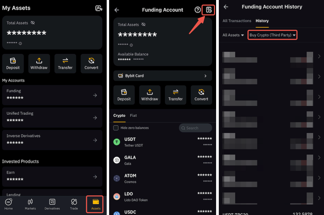 On the App, please go to the Assets tab → Funding Account, then click on the History Icon on the top right corner, tap on History and select Buy Crypto (Third Party).