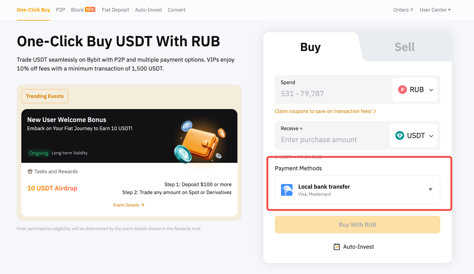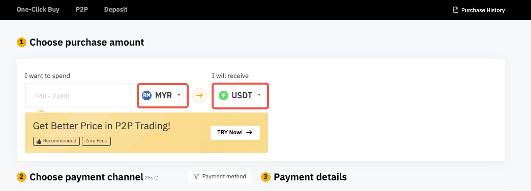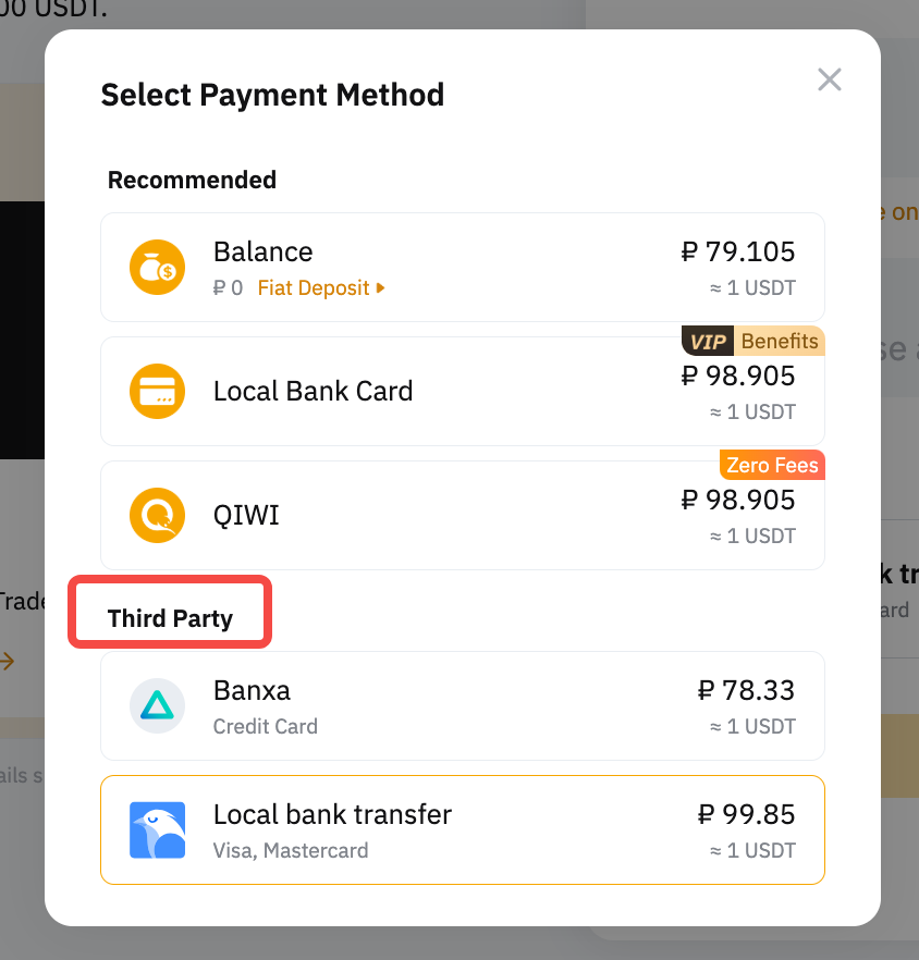You can find the list of supported Fiat and cryptocurrency options on the One-Click Buy page, and find the availability of third-party payment methods. Alternatively, you may go to the Third Party order page by clicking on the Fiat or coin drop-down list.