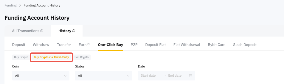 You will be able to retrieve the deposit records from your Bybit assets page under the One Click Buy tab by clicking on Buy Crypto via Third-Party.