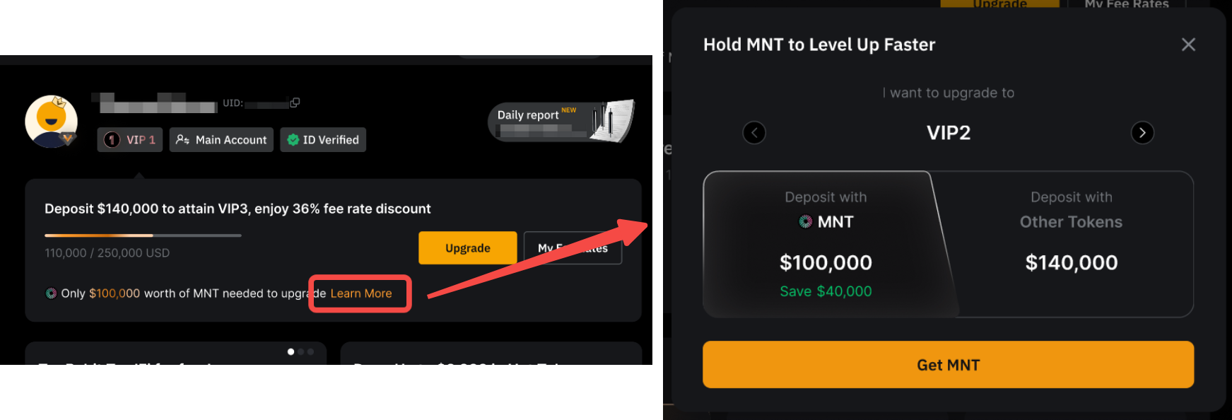 Go to your VIP Me page by clicking your profile picture in the upper-right corner of the screen. Then click the Learn More button next to the “Only a $ {certain amount} worth of MNT needed to upgrade” to see how much more you need to deposit to level up.