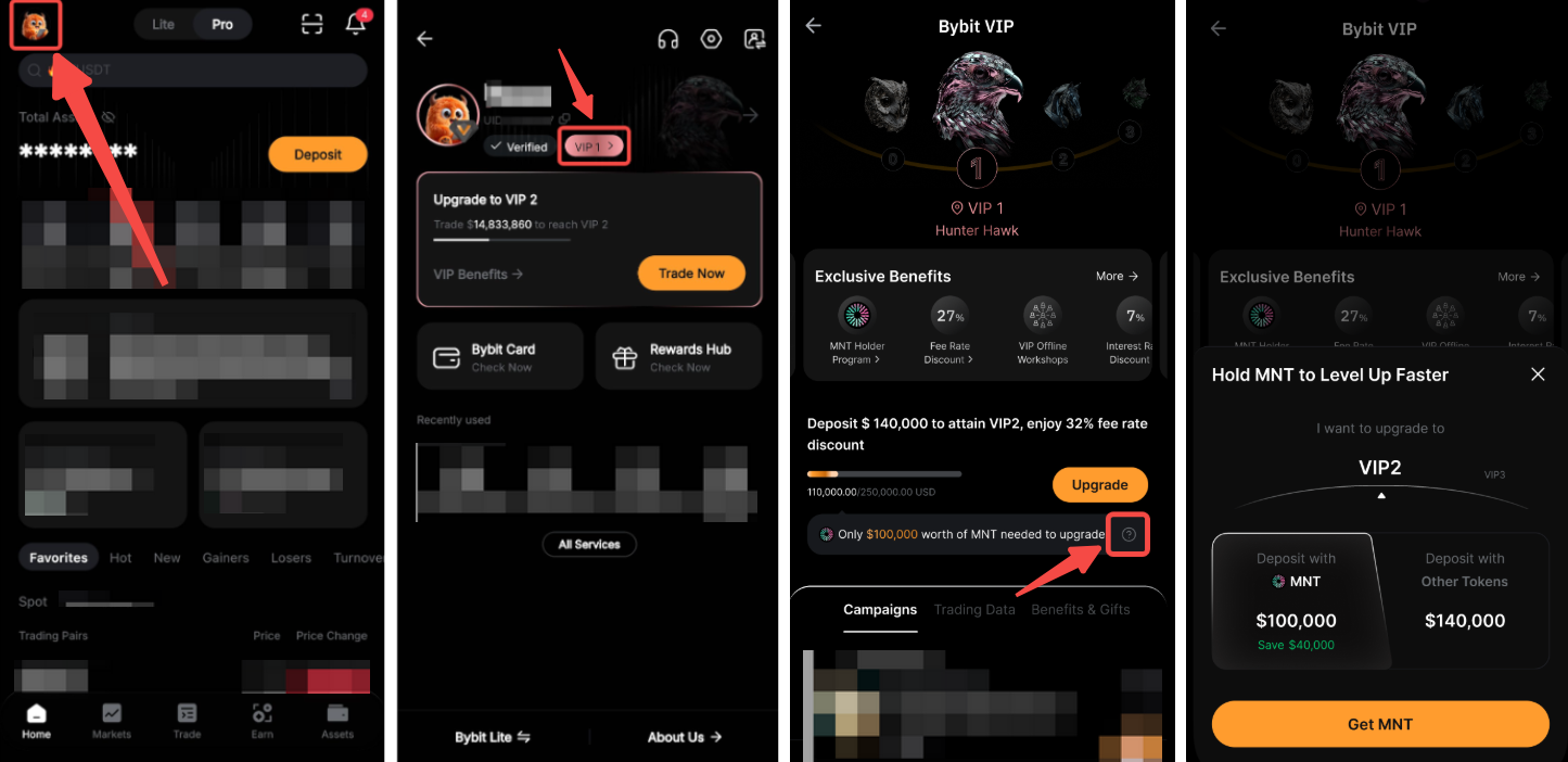 If you're using the app, tap your profile picture in the upper-left corner, then tap your VIP level. Next, tap the question mark icon next to “Only a $ {certain amount} worth of MNT needed to upgrade” to see how much more you need to deposit to level up.