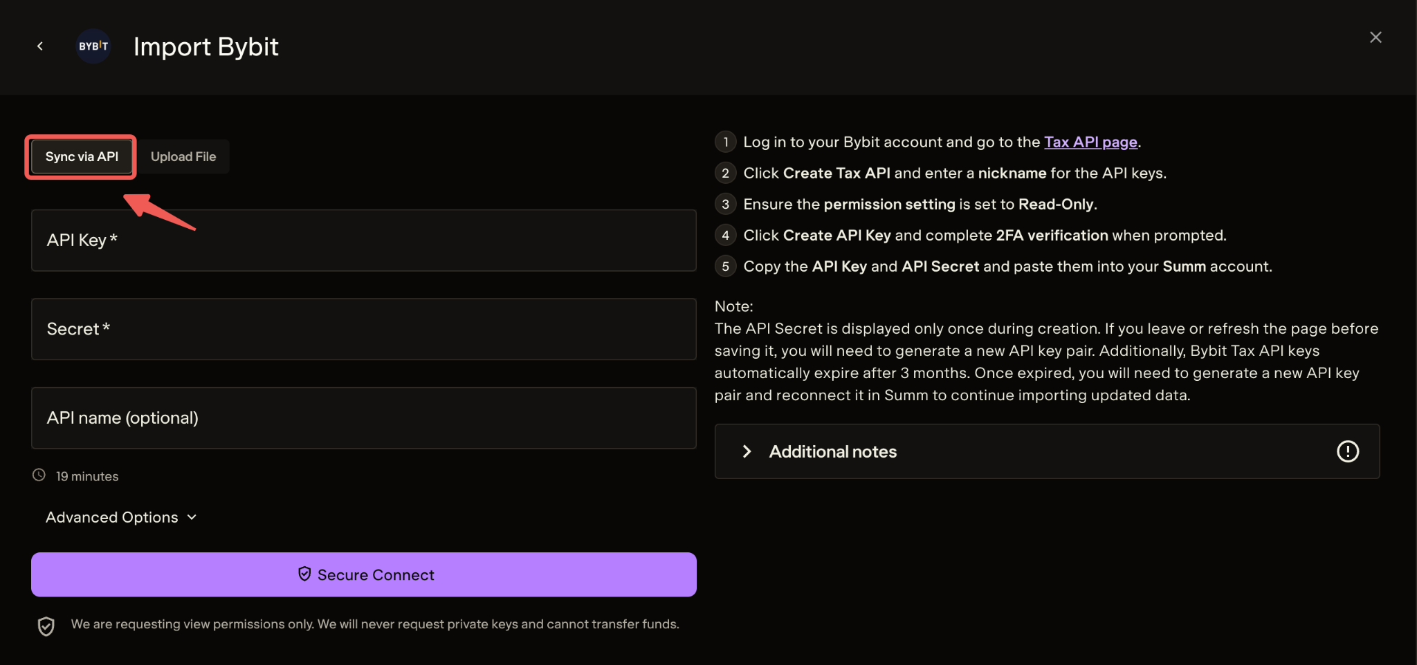 Once you have created the API Key on Bybit, select the option Sync via API in Summ and enter the generated API Key and API Secret. Click Secure Connect once done.