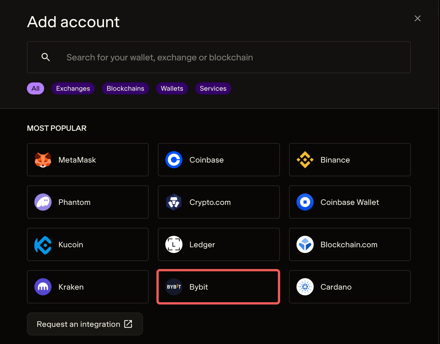 Step 2: Navigate to the Accounts tab, click on + Add accounts. Select Bybit from the list of exchanges.