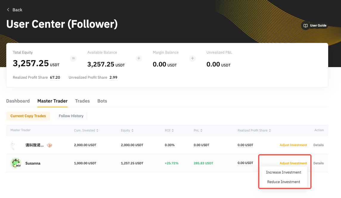 Step 1: Go to User Center (Follower) → Master Traders → Adjust Investment. Then, click on Increase Investment or Reduce Investment.