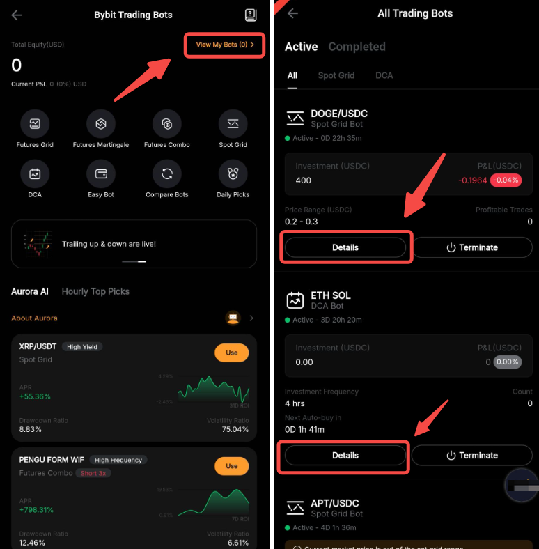 You can click on Details in the upper right corner of the grid bot you wish to view to explore more information, including the current status of your Spot Grid Bot, current orders under the Holdings tab, and your order history.