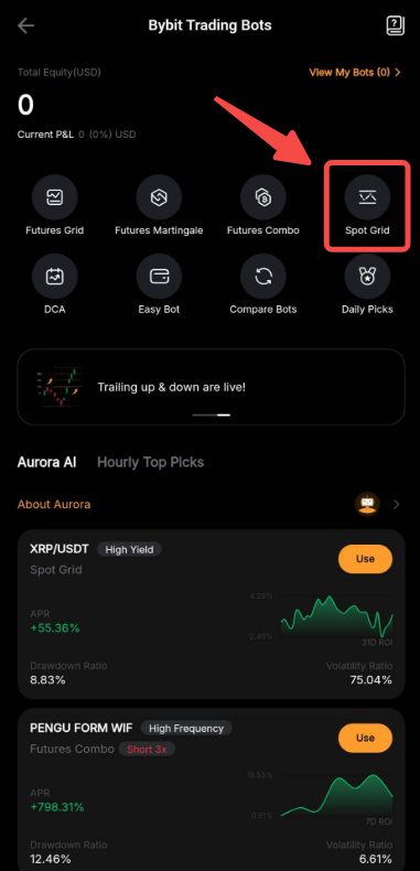 By using AI Strategy, the system will suggest the parameters based on the historical data performance of the Spot trading pair. Alternatively, you can also refer to the suggestion from Aurora’s Picks to create a Spot Grid Bot based on your preferences.