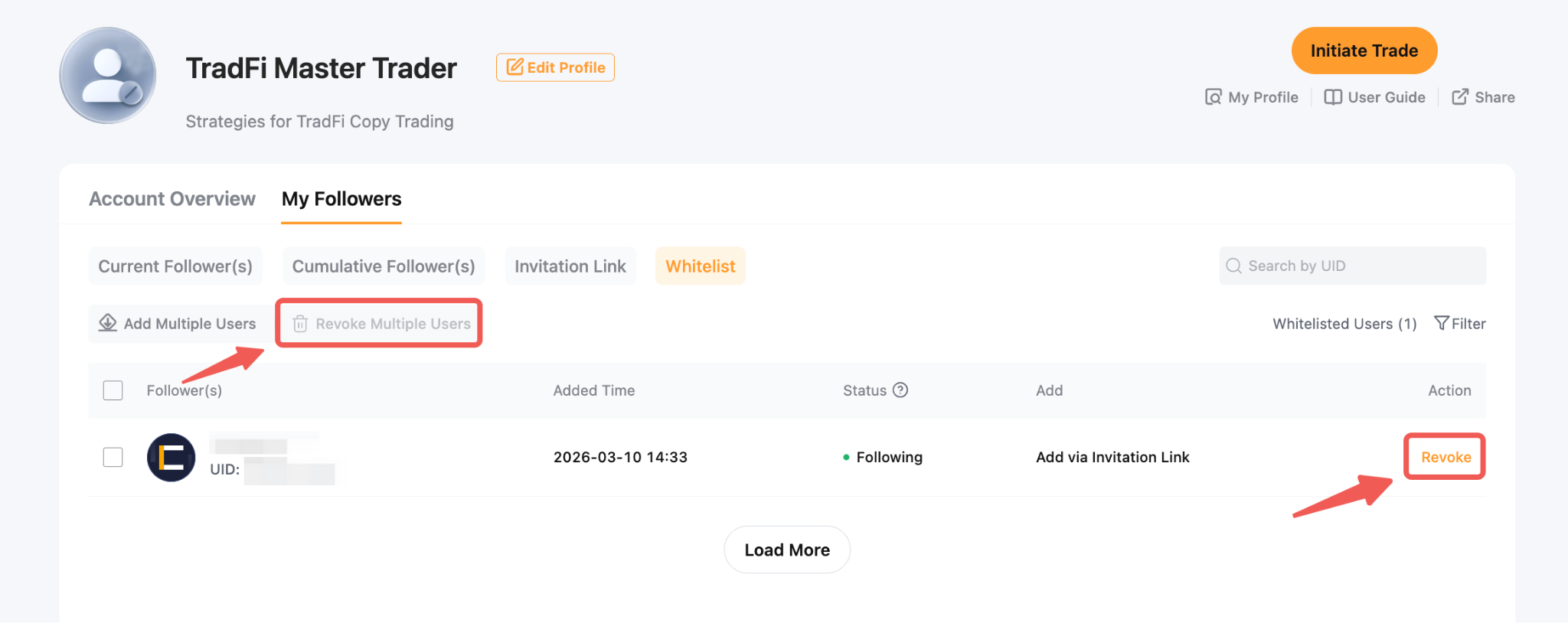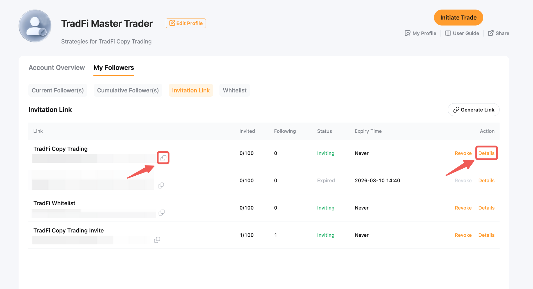 Copy Trading TradFi provides two features — Invitation Link and Follower Whitelist — that allow Master Traders to manage who can follow their trades.