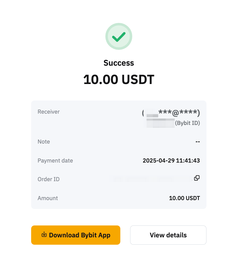 Bybit Pay Internal Transfer allows you to instantly send fiat and have your recipient receive crypto, or send crypto and have your recipient receive crypto or fiat assets — all with zero transaction fees. Currently, sending fiat via this feature is available on the Bybit App only. Web support will be launched soon.