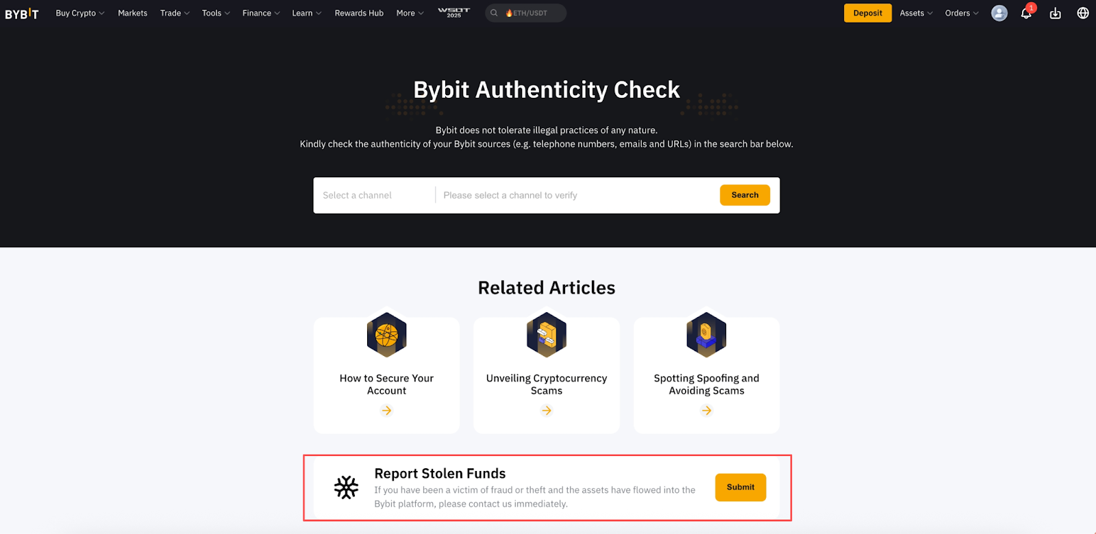 Visit the Bybit Authenticity Check page and click Submit in the Report Stolen Funds section.