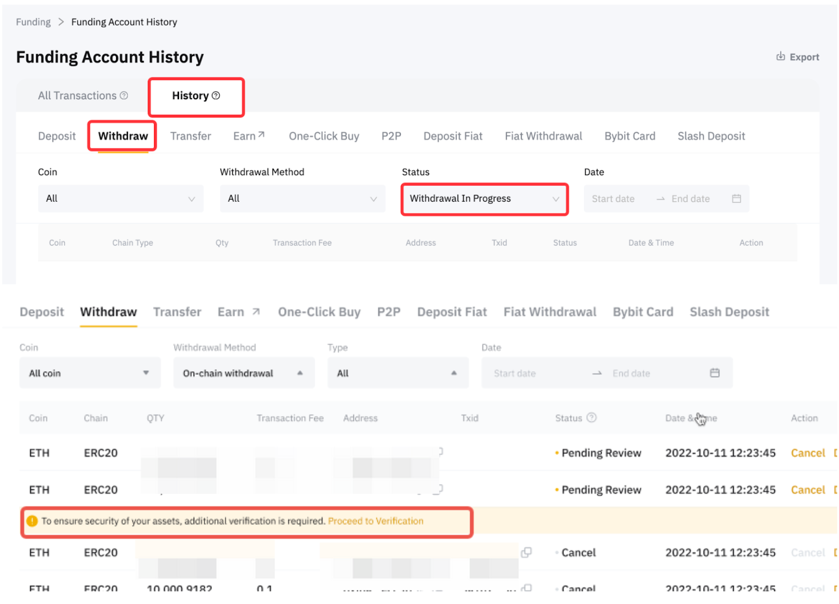 Step 2: Select Withdrawal In Progress under Status Filter and look for the order that contains “To ensure security of your assets, additional verification is required. Proceed to Verification”, and click on Proceed to Verification.
