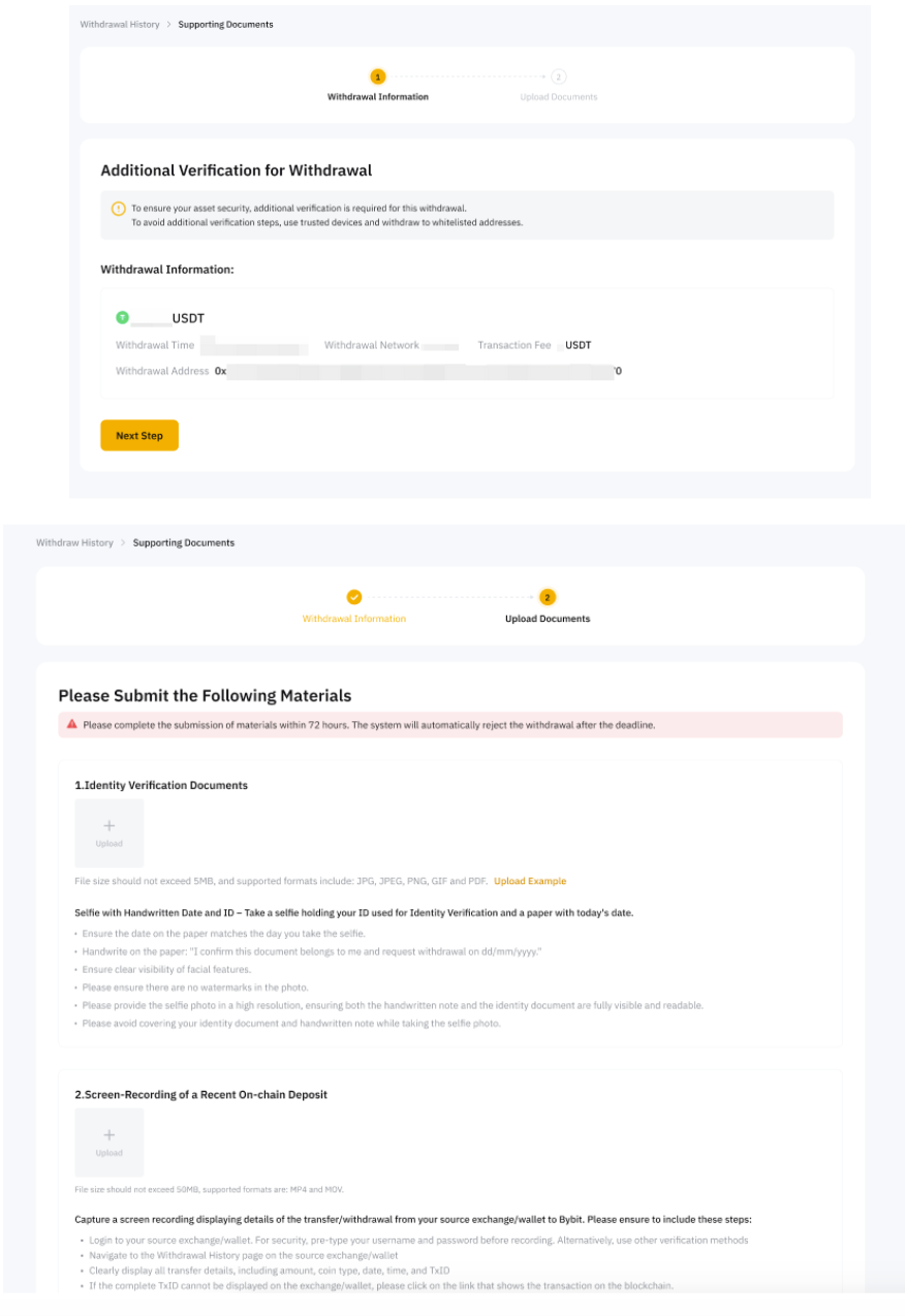 For security reasons, you may need to submit additional information to verify your identity during the crypto withdrawal process. Failure to provide documents within 72 hours will result in instant withdrawal rejection.