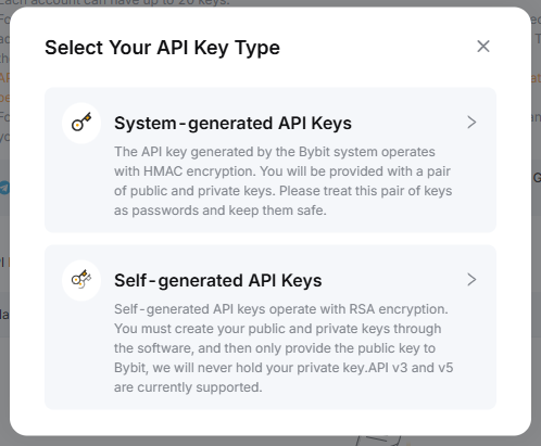 Step 2 : Click on Create New Key. A pop-up window will appear where you can select the API Key Type that best fits your trading needs.