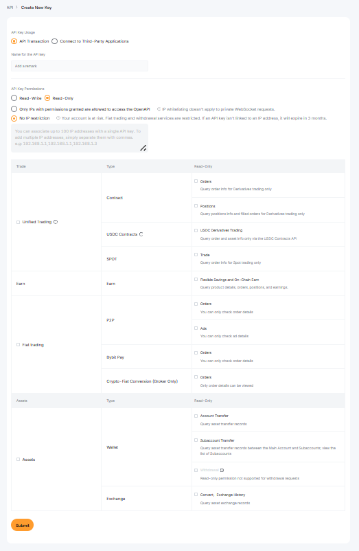 Step 3: Configure your API Key. Please ensure to set the API Key permissions as Read-Only. Click on Submit once done.