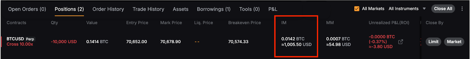 In derivatives trading, the Initial Margin (IM) is the minimum margin required to open a position. The leverage selected by traders directly affects the Initial Margin required. The higher the leverage used, the lower the Initial Margin required to open the position.