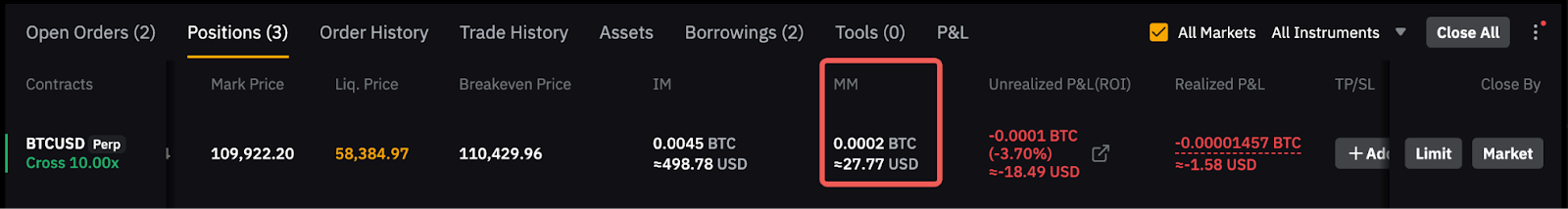 The maintenance margin (MM) required by the position can be found in the position tab.
