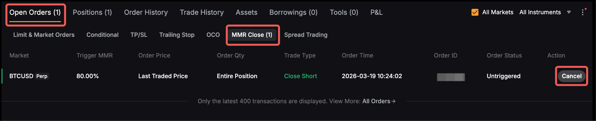 2. Creating an MMR Close Order for a partial position quantity is not supported, and only one MMR Close Order can be set for each position.