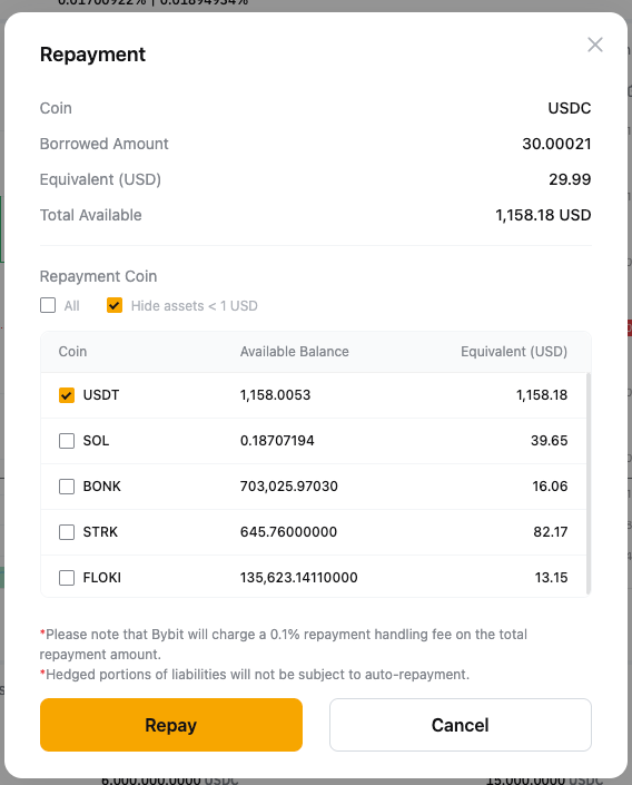 Step 2: The system will first use your available borrowed coin for repayment. Any remaining amount will be covered by converting your collateral into the borrowed coin.