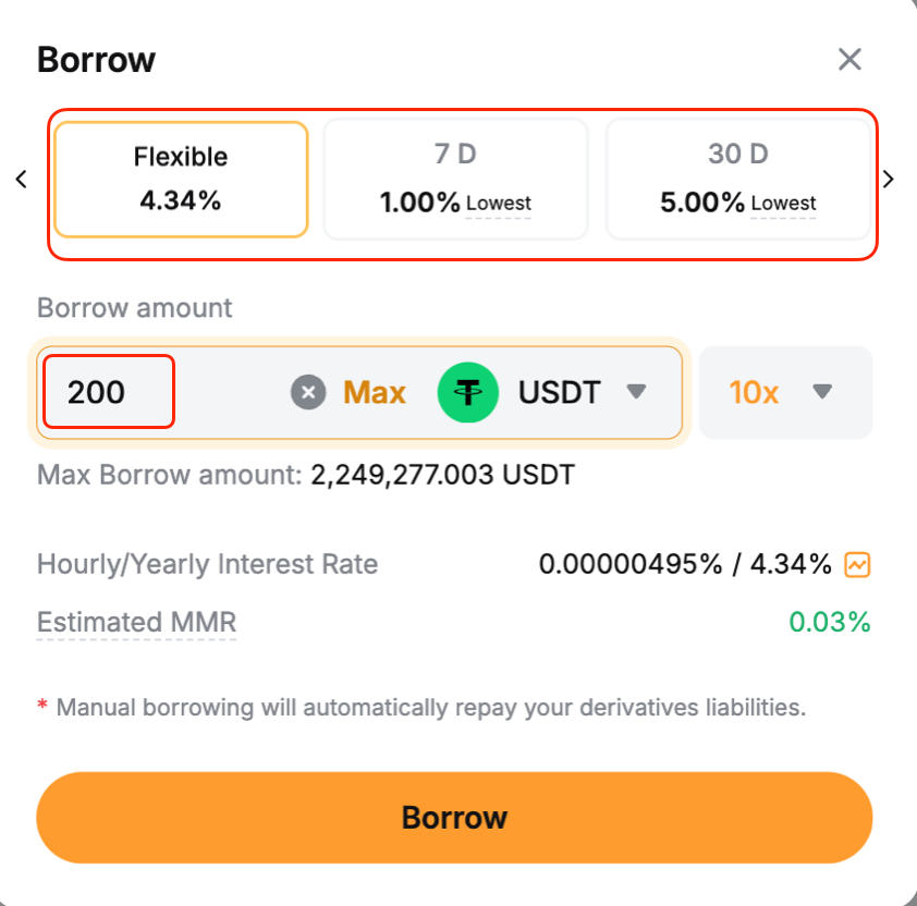 Step 2: Select the loan type (Flexible or Fixed) and enter the amount. Click Borrow to confirm.