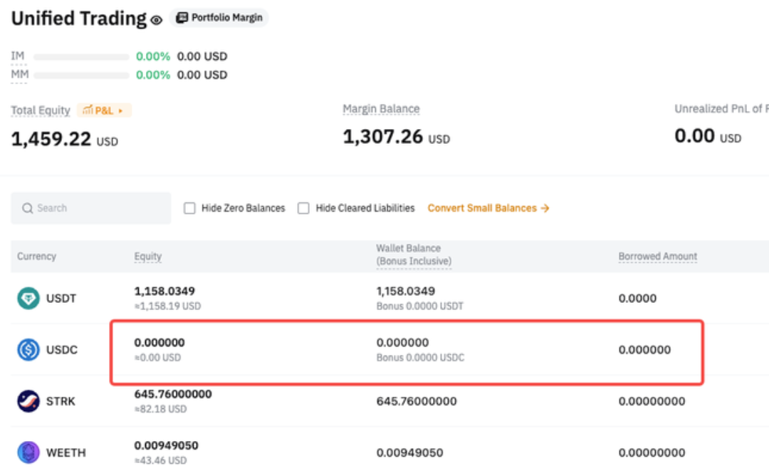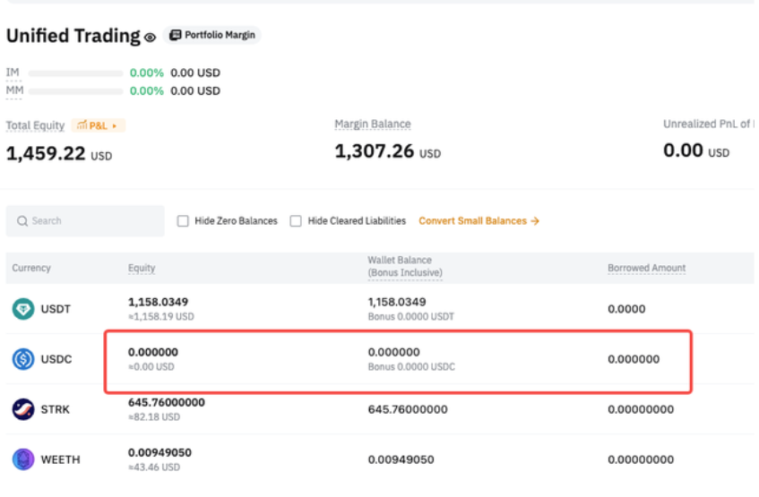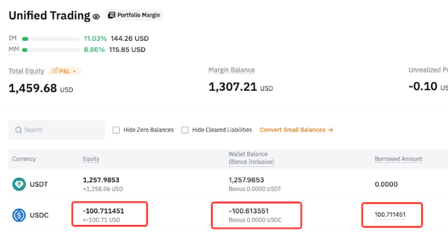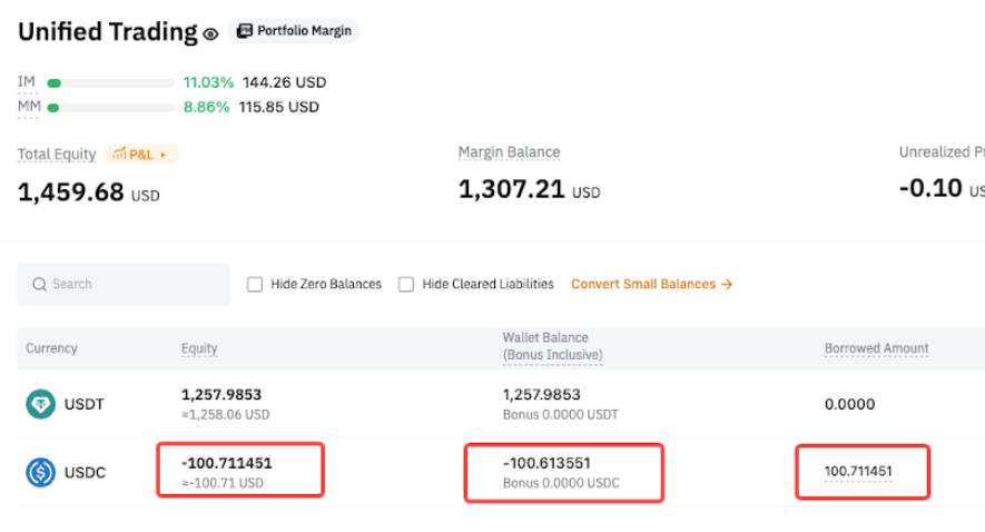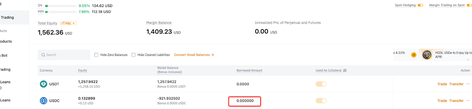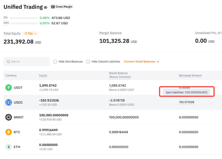 After transferring in USDC, only Derivatives liabilities are repaid automatically, while Spot liabilities remain unpaid. - Spot liabilities = 100