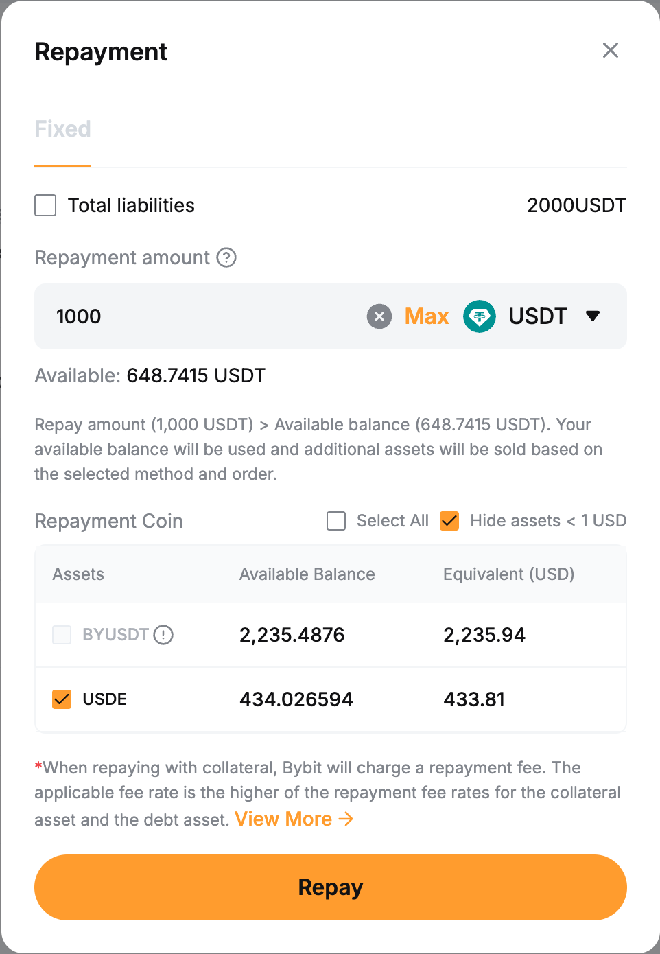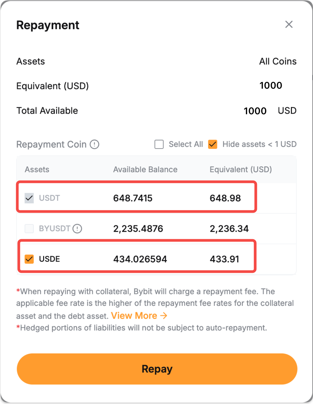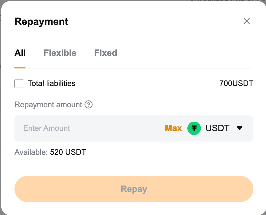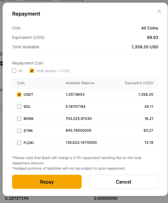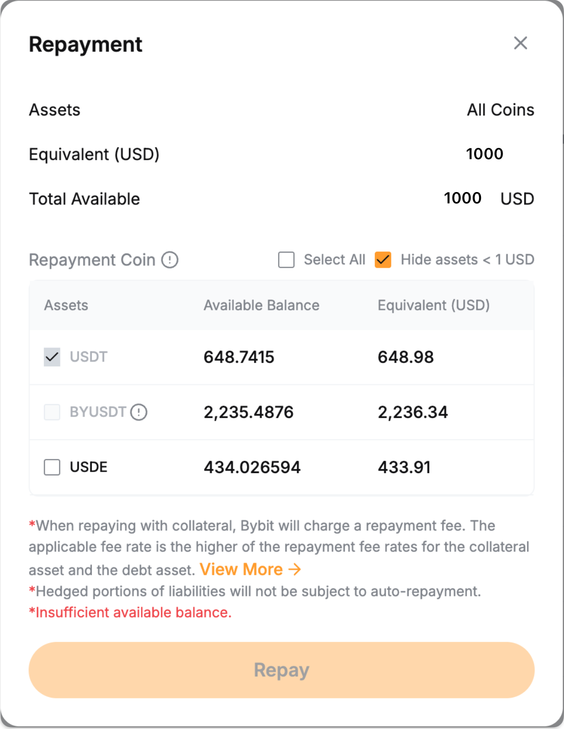 If you have insufficient borrowed coins, you can make a full repayment with other collateral assets. The system will convert collateral to repay the borrowed coins, and a 0.1% handling fee will apply. | To make a single-coin repayment: