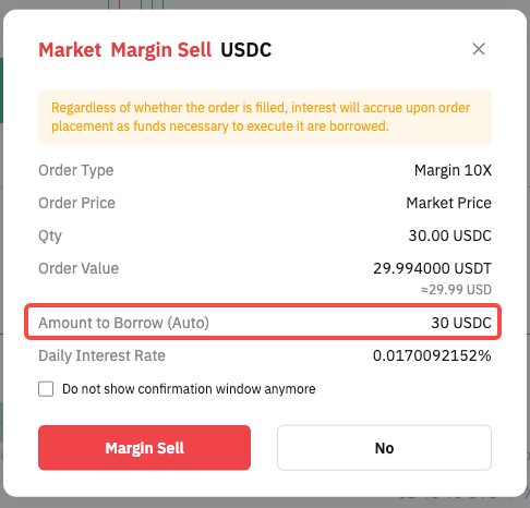 Example You place a Spot Margin order that is filled immediately. The system automatically borrows the required amount. |