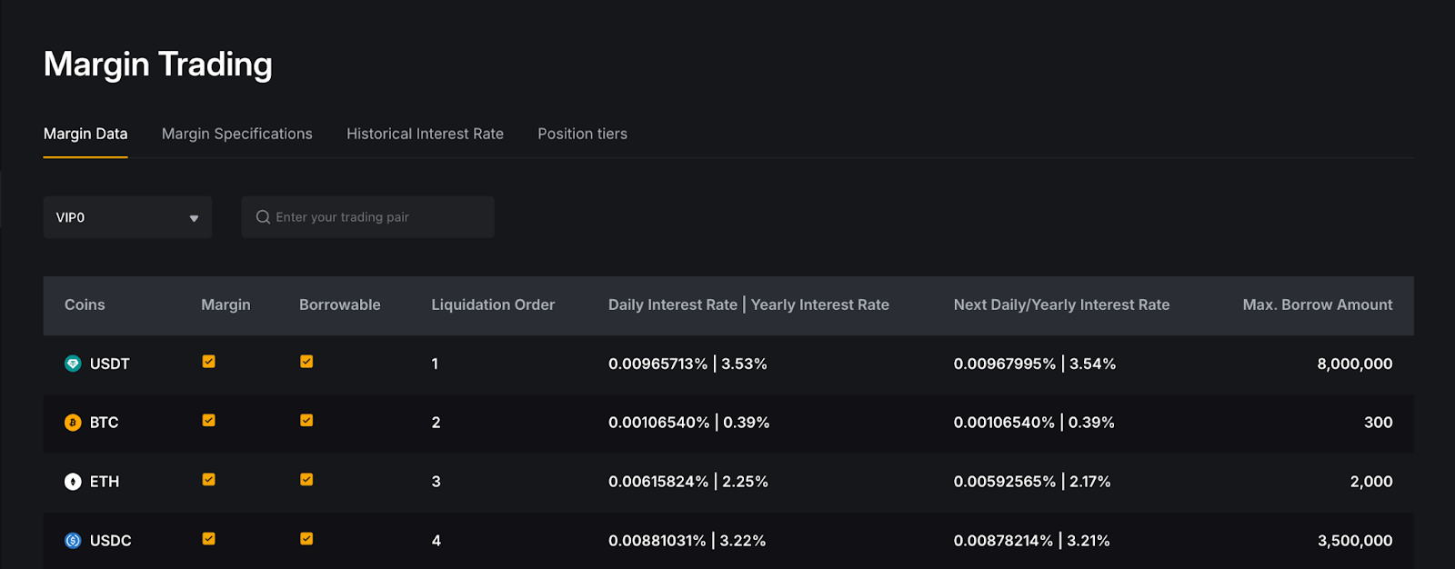 Please note that interest rates vary daily. In addition, each VIP level will enjoy different daily and yearly interest rates. You can refer to the daily interest rate, yearly interest rate and maximum amount to borrow for each coin here.