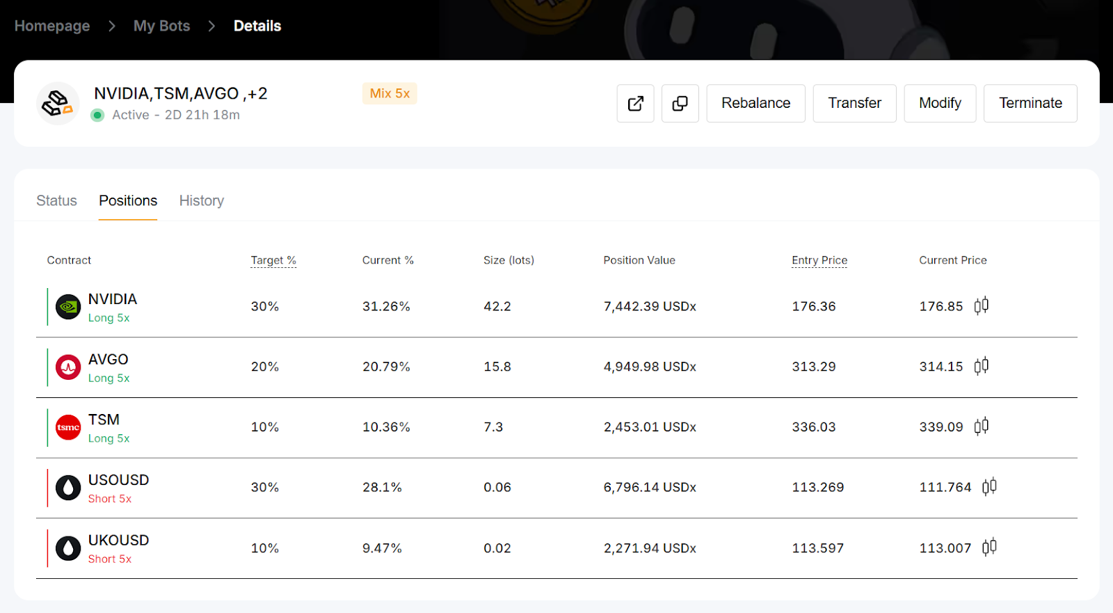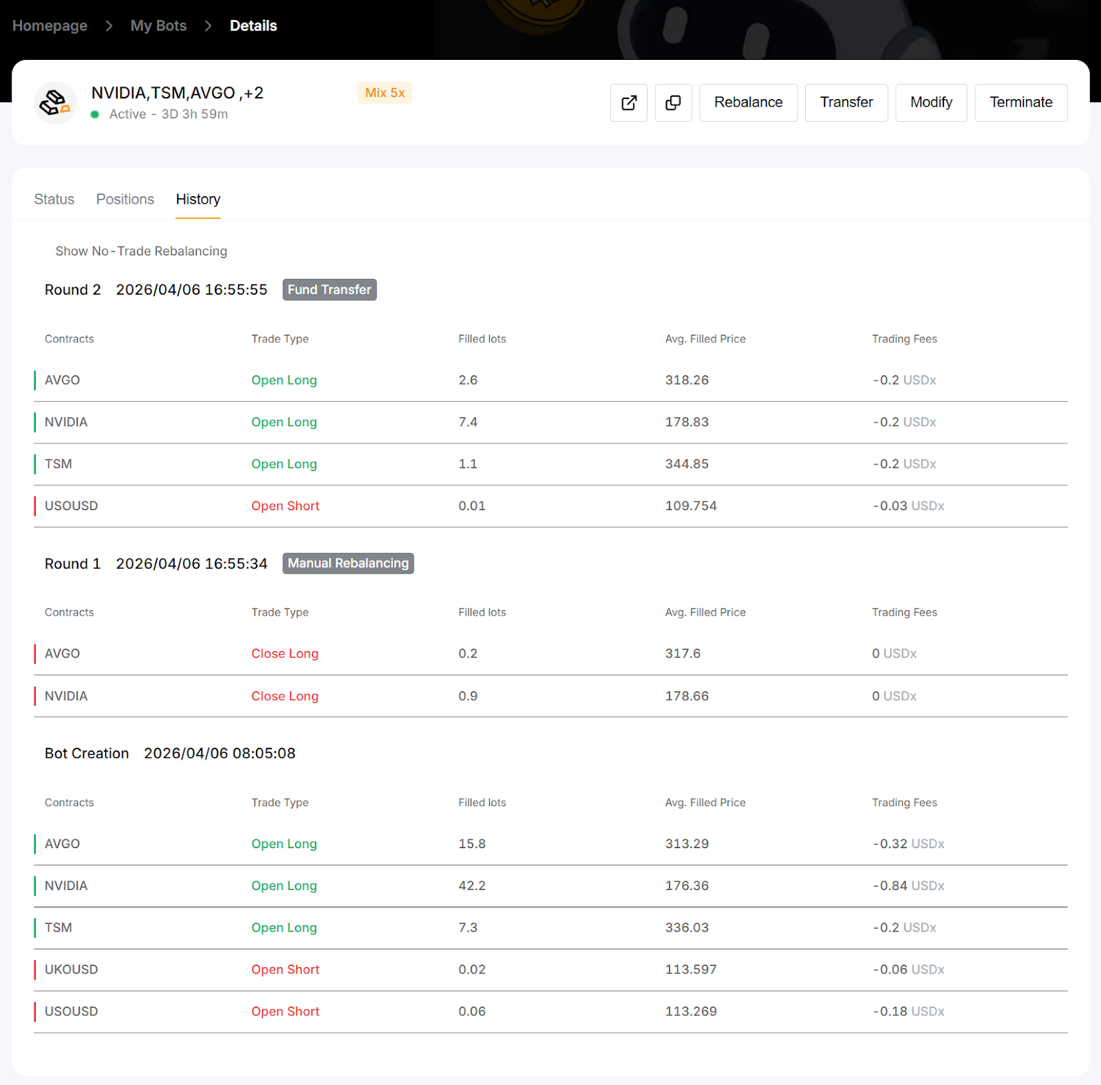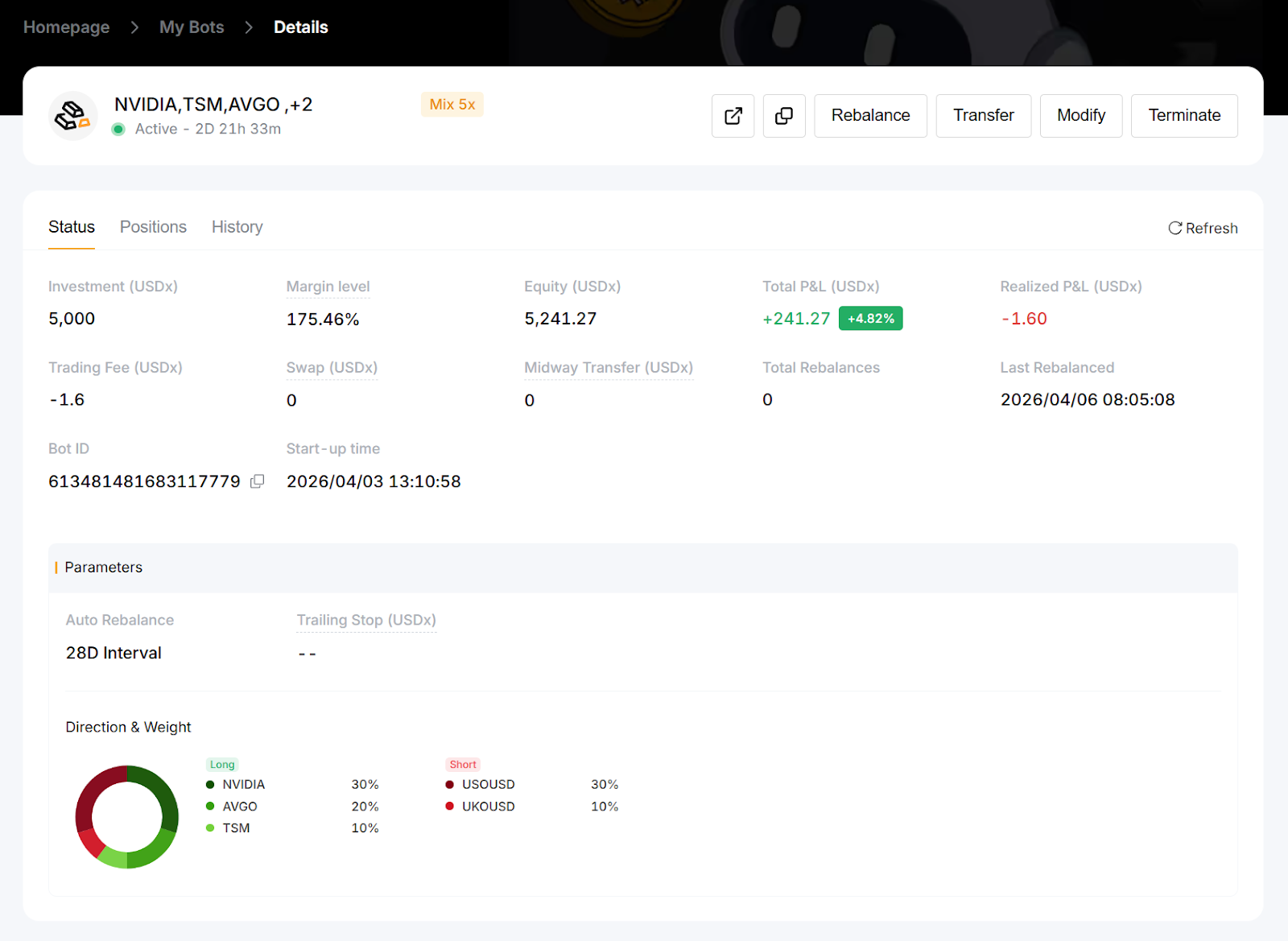 Note: If any contract in the bot is suspended due to market closure, added funds will not trigger rebalancing and will be used as margin only.