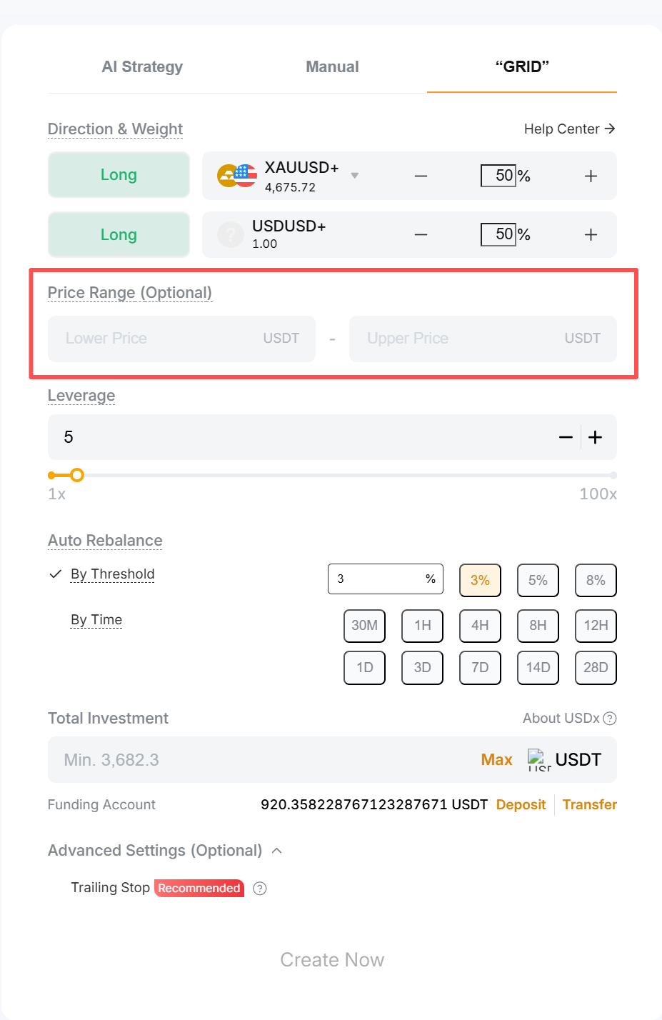 In the Grid mode, the system follows a structured rebalancing strategy designed to simulate a grid strategy. All parameters are the same as in Manual mode, with the addition of a defined price range.
