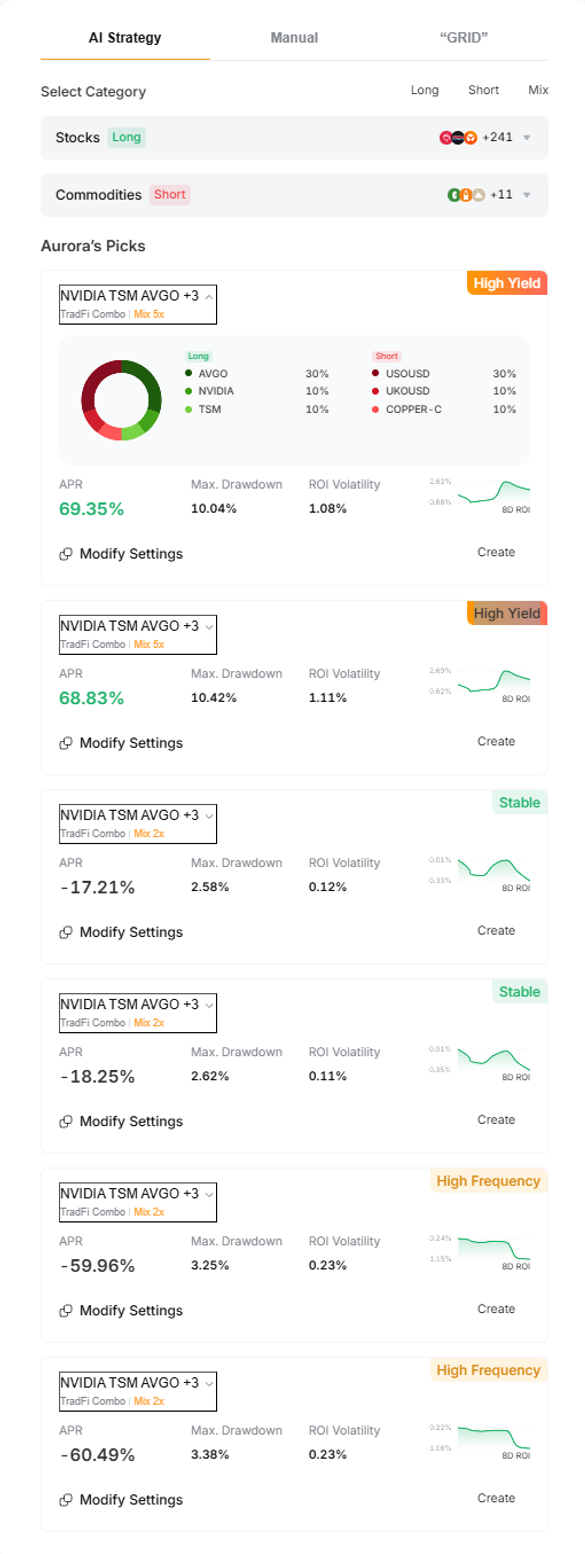In the AI Strategy mode, you'll find six pre-built strategies under Aurora's Picks, generated by AI using historical data and expected market trends. You can choose from high-yield, stable, or high-frequency strategies based on your trading style and deploy your combo with a few clicks. This makes it easier for beginners to get started.
