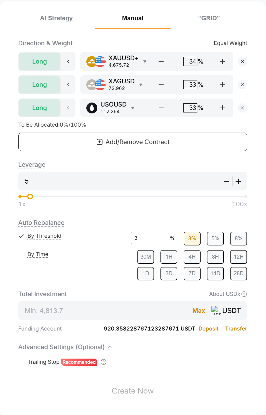 Shows the percentage of your portfolio that has not yet been allocated. To create a TradFi Combo Bot successfully, the total allocation must reach 100%.