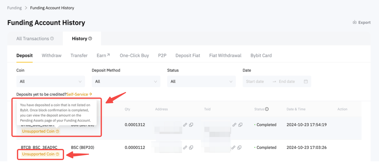- If you see an unsupported coin remark in the deposit record, please follow the A) Self-Service guide below which allows you to initiate a withdrawal.