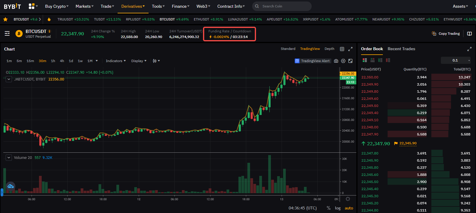 Con el fin de ligar el precio de trading del contrato perpetuo al precio spot, el mecanismo de financiación se utiliza para garantizar que el último precio de trading en Bybit esté siempre ligado a los precios spot estándar globales. A continuación, se ofrece una breve descripción general de cómo funciona: si el precio de mercado del contrato perpetuo se sitúa por encima del precio spot (es decir, la tasa de financiación es positiva), los titulares de posiciones largas pagarán las tarifas de financiación a los titulares de posiciones cortas. Esto incentiva a los traders a abrir más posiciones cortas y reduce los precios de trading, que tienden hacia el precio spot.