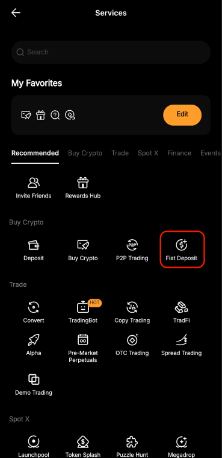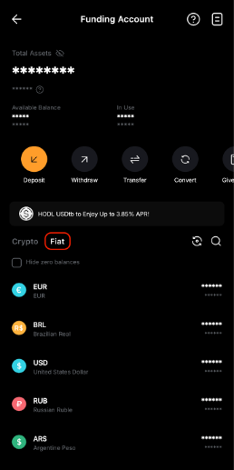 En la aplicación, vaya a la página Activos y toque en Financiación → Fiat. Luego, toque la moneda Fiat y consulte las tarifas asociadas para cada método de pago.