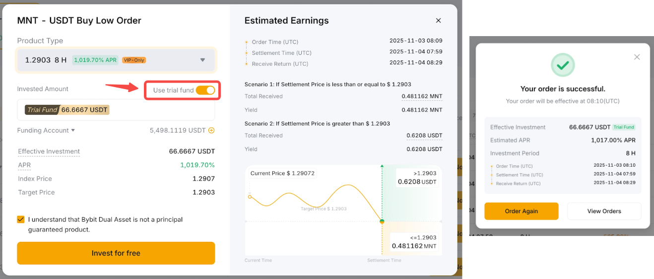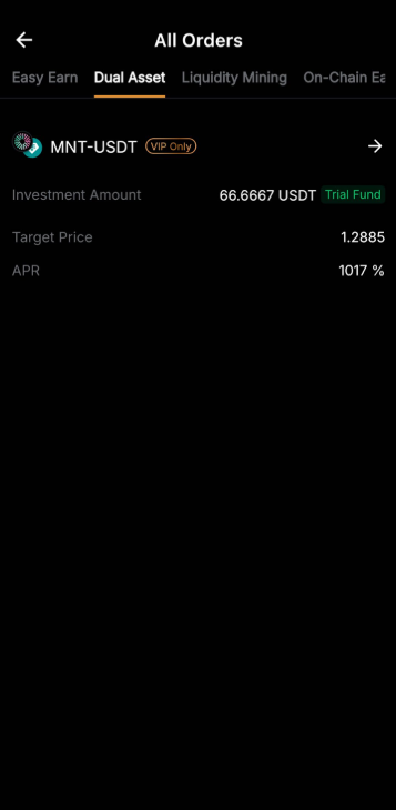 デュアルアセットトライアルファンドでは、コストを被ることなく、実際のデュアルアセットのリターンを体験できます。収益は、製品の決済価格とAPRによって決定されます。利回りはあなたの口座に追加されますが、トライアルファンドの元本はあなたの総資産にカウントされません。