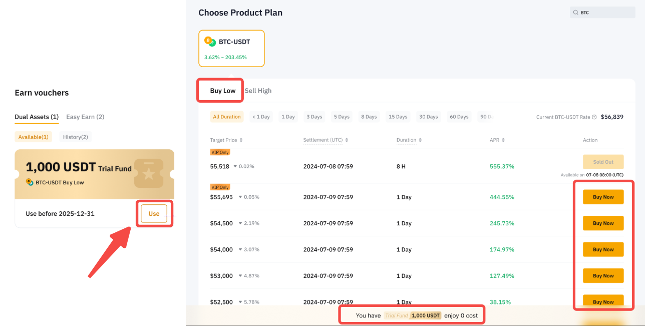 Useをクリックすると、Buy Lowプロダクトに移動します。ご希望の投資商品で今すぐ購入をクリックします。
