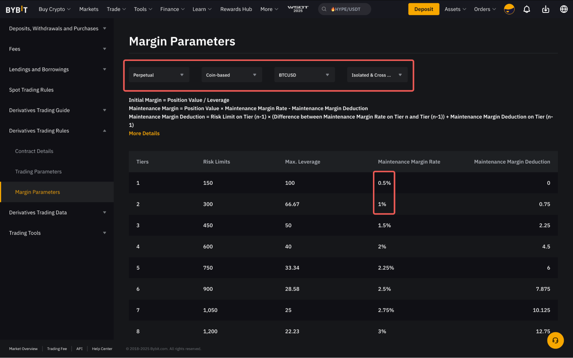 各リスク制限階層に必要なMMRと維持証拠金控除額は、マージンパラメータページで簡単に確認できます。