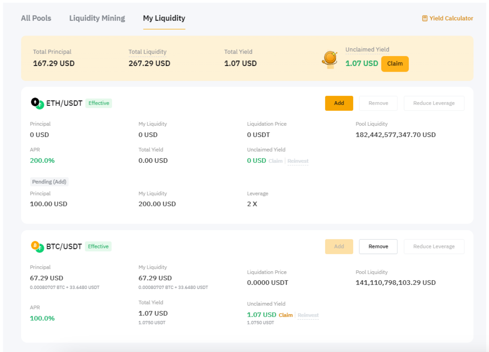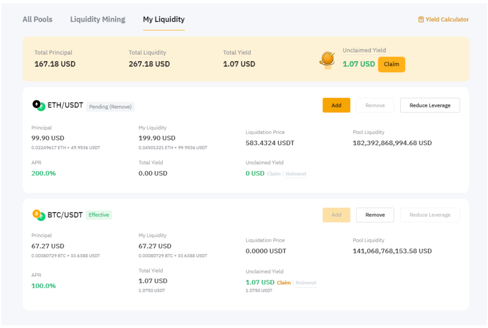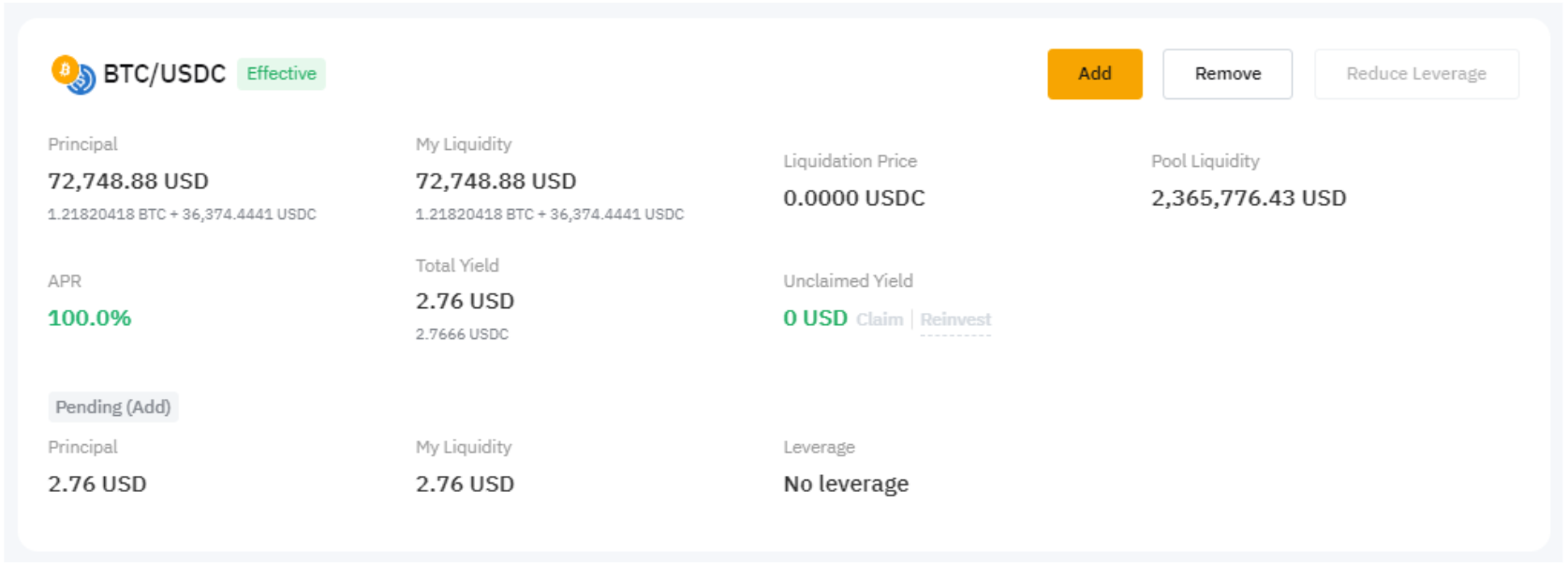 Lá, você pode facilmente gerenciar as suas posições, optando por adicionar mais liquidez, remover liquidez, fazer swap de tokens ou resgatar e reinvestir seus rendimentos, além de reduzir a alavancagem.