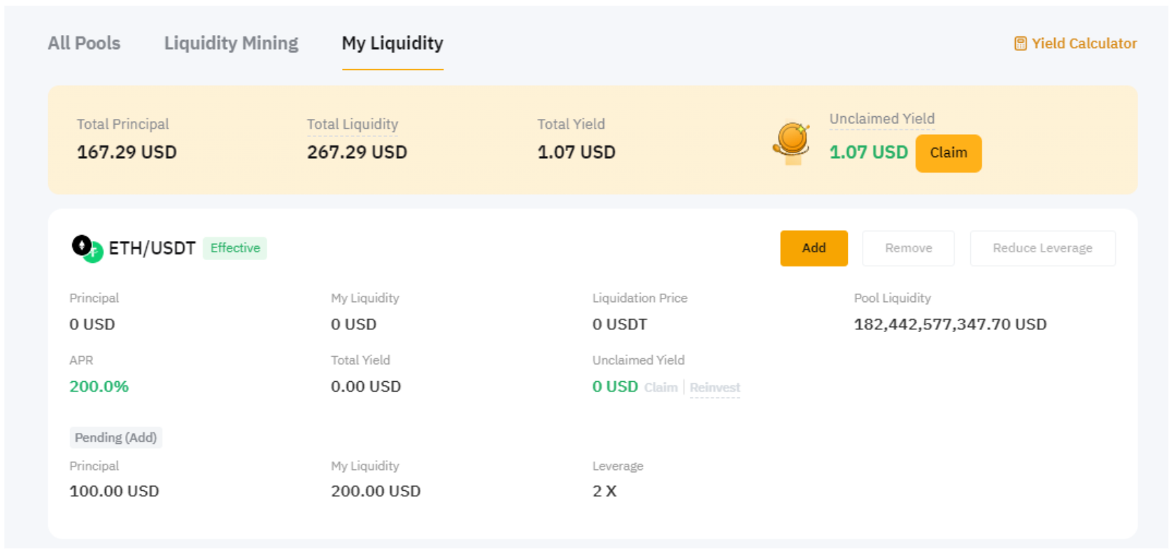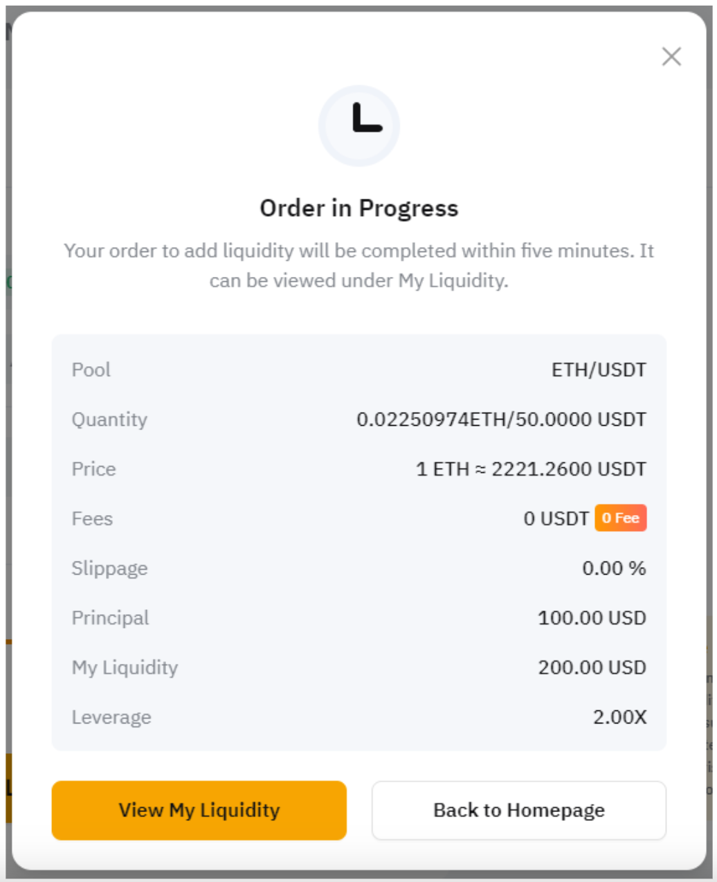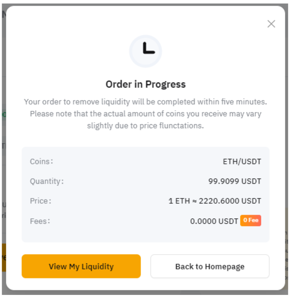 A ordem para adicionar liquidez será concluída em até cinco minutos. Enquanto uma nova adição de liquidez estiver pendente, não será possível remover liquidez do par de trading correspondente.