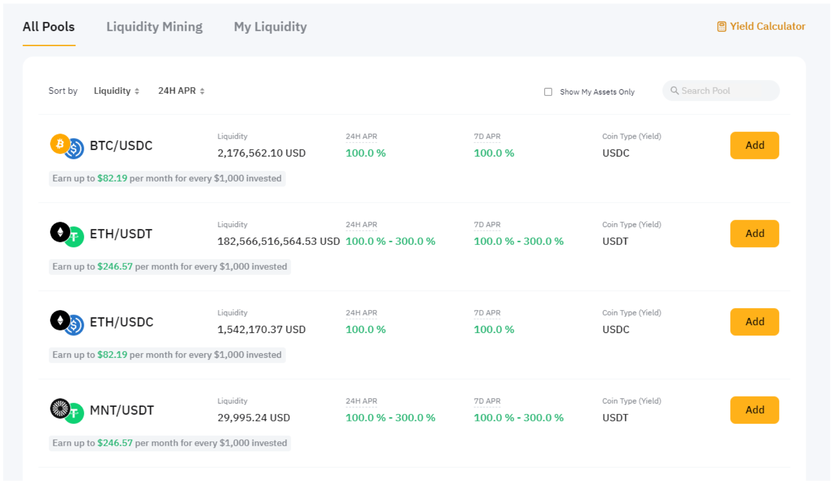 2º passo: Selecione um pool de liquidez. Em Todos os pools, confira os pools disponíveis e escolha aquele ao qual você quer adicionar liquidez. Clique em Adicionar para acessar a página “Adicionar liquidez”.