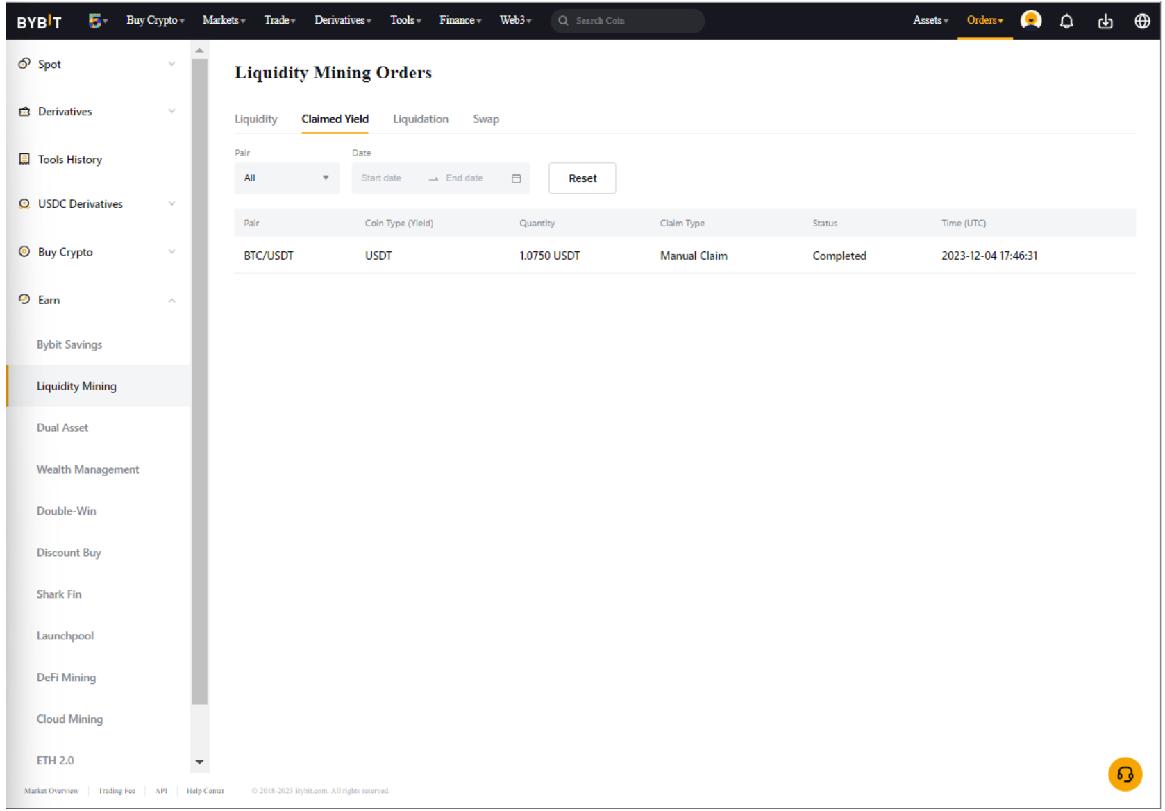 Para ver as informações sobre seus rendimentos resgatados, acesse Ordens → Ordem do Earn → Mineração de Liquidez → Rendimento resgatado.