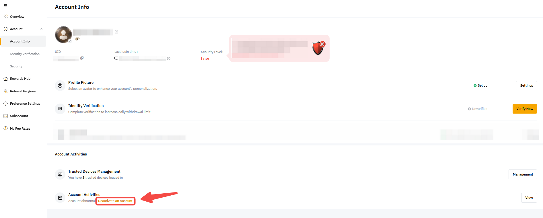 A Bybit lançou um recurso de desativação de conta de autoatendimento, que permite que os usuários desativem suas contas por conta própria por meio da página Conta, em vez de enviar solicitações de desativação de conta para o atendimento ao cliente da Bybit.