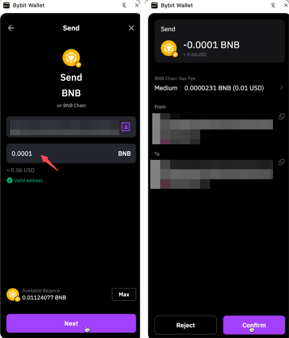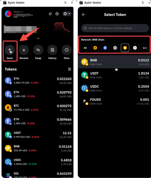 Крок 3. Натисніть Надіслати та вставте адресу вашого гаманця у поле введення. Переконайтеся, що ви вибрали BSC, інакше ваші USDT та BNB можуть бути переведені неуспішно.
