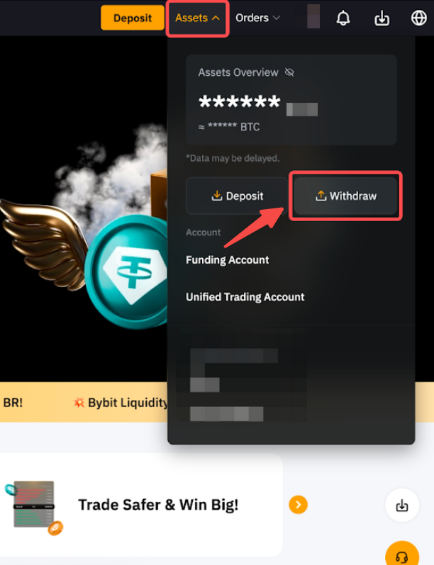 Крок 1. Наведіть курсор на Активи у верхньому правому куті сторінки Bybit, а потім виберіть Вивести.