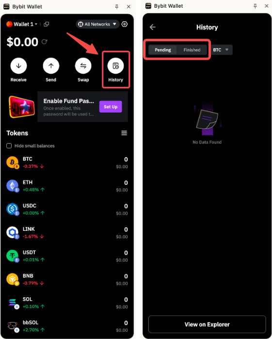 Натисніть Історія на порталі Гаманця Bybit, щоб переглянути історію депозиту та виведення на вкладках В очікуванні та Надіслано.
