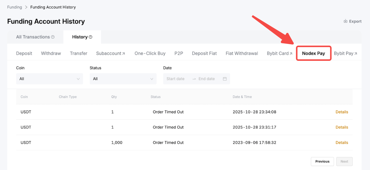 Bước 5: Sau khi giao dịch hoàn tất, bạn có thể xem hồ sơ lệnh trên trang Lịch Sử Tài Khoản Funding. Để chỉ xem hồ sơ Nodex Pay, chỉ cần nhấp vào Nodex Pay.